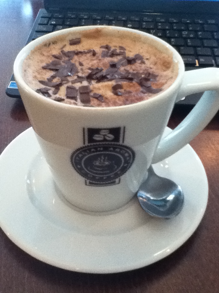 Unfortunately, it did not deliver. There was a sweetness first kicking from the top of the coffee (dusted with chocolate shavings) and from the bottom of the cup, which, however, quickly gave way to an overwhelming bitterness; my guesses: poor quality espresso, not enough espresso in the coffee machine (which led to the shots being watered down) or the shots having waited too long on the side before being mixed with milk and chocolate.