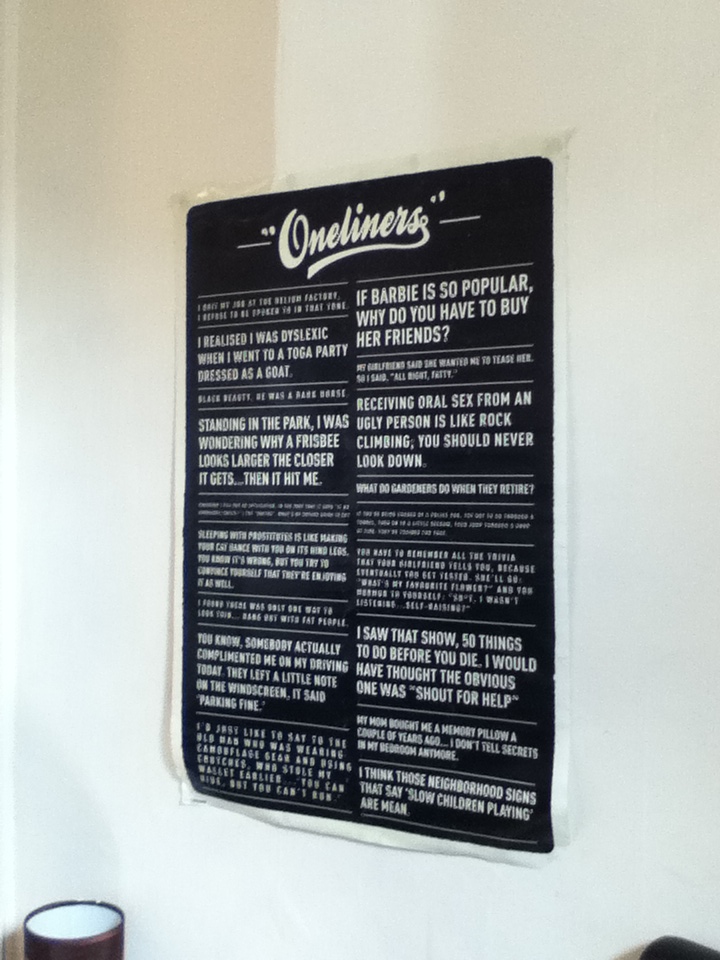 I requested my medium size drink and was invited inside, to take a seat. Modestly decorated, the place had a lot of character, and actually set my day to a great start (despite the pancake fiasco) thanks to the poster with one-liners on the opposite wall that absolutely cracked me up. I was served my coffee shortly after, and a couple of minutes later, I was out; and that’s a good thing. First of all, the coffee was nicely presented and was of good size, especially considering the price. The texture was excellent: smooth and creamy, no separated sections of foam and milk, and the amount of chocolate was just right. And, of course, the temperature was ideal to drink up quickly without getting one’s tongue scalded. When it came to paying, I was asked by the older-looking guy whether I enjoyed my coffee: for me this is a sign that someone cares, as they are prepared to take on criticism; I also figured he was the one making my drink, which then confirmed my guess that he was a senior barista in the place. Whether it was thanks to his presence or not, this was a lovely experience which proved that appearances can be deceiving: although one place might seem small, it might hold a great potential within. And yeah, Fair Trade does taste good sometimes!