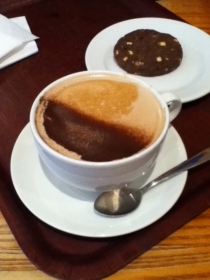 The waitress from earlier was right; just as we left the queue she pointed to us a table by our side. “Isn’t this reserved?” I asked, looking at the wee sign on the table, which she quickly took off after shaking her head (and as we were leaving, the sign reappeared on the table which I found rather amusing). We sat down on hard chairs in this dim, noisy place, and looked at each other, utterly unamused. There was certainly no magic in this venue, but at least it explained why Rowling books are so dark and depressing – if here is where she found her inspiration… We drank our coffees fairly quickly, because neither of us was enjoying ourselves, and the coffee didn’t help one bit. Mum usually drinks filter coffee, so no wonder she didn’t feel very well after having a mocha; but neither did I. It was nicely presented and had good texture, no thick foam on top or separated layers; it was also of good drinking temperature and I did enjoy the first few sips of it. However, something about it just didn’t work quite right, and the more I was drinking, the more weary I felt. It was hard to pinpoint, but the only sensation I could identify and name was that it tasted very heavy on the milk side, which was overwhelming the coffee and chocolate within – especially noticeable when I ran out of cookie to go along with it.