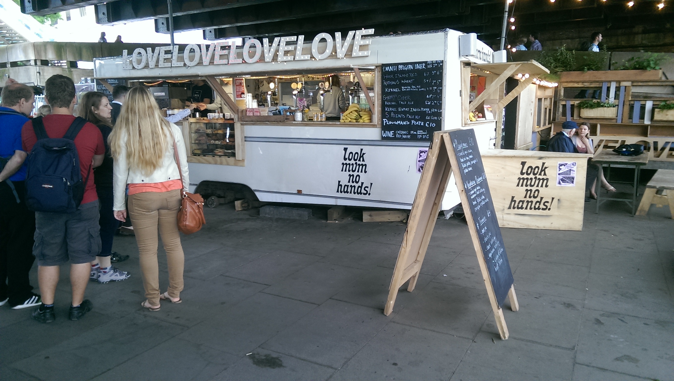 Coffees in hand, I joined my companion at one of the creatively designed tables, which had beer crates converted into stools – strategically positioned under the Hungerford Bridge to protect us from the rain that threatened to ruin the stroll. The train tracks just above our heads, and frames of bicycles with no wheels centrally in the view, added to this outre experience; and to top it off, we soon learnt it was the Queen’s birthday, as a massive Voyager flew over, followed by some Red Arrows, trooping the colours on the sky.