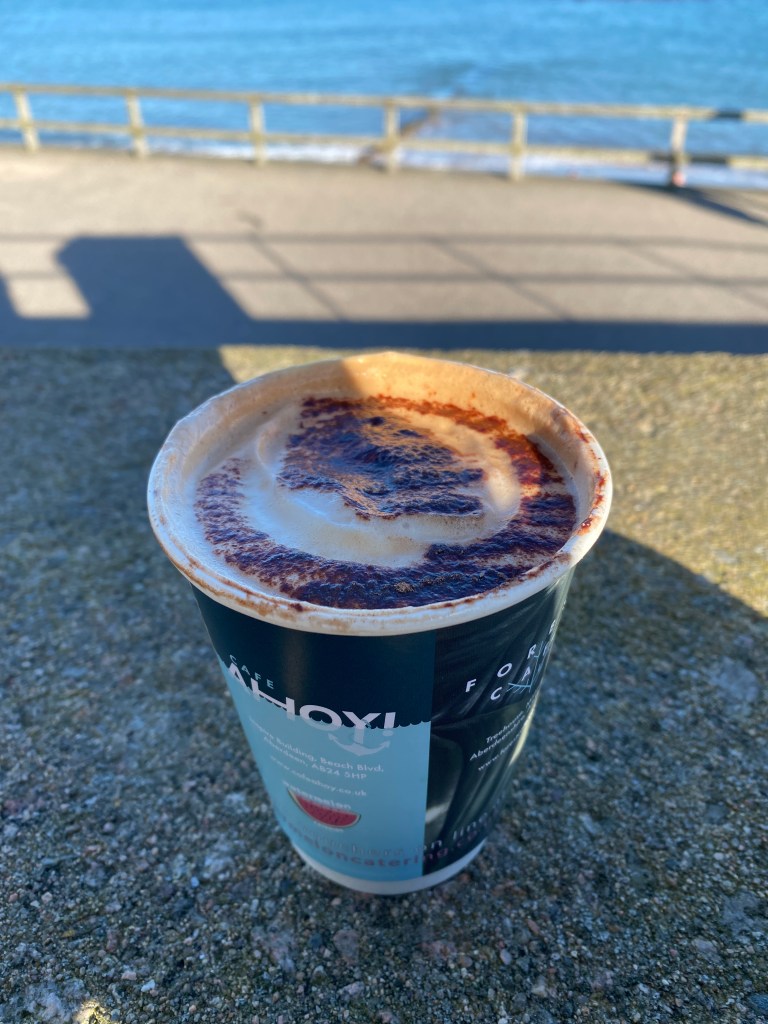 The board by the window indicated they had soya, oat and coconut milk alternatives at a 30p supplement, so – curious to compare against my amazing experience at Parx – I went for the latter in my mocha. The barista first made my coffee, then took the payment, which I thought was the right order of things – it also let me peer inside the shop to spot the cartons of coconut alternative they were using, which I had never seen before, but got me pretty excited (now I’m off searching for one, to try my hand at it at home…). After those extra couple of minutes I was finally emerging back into the sunshine and onto the super-crowded beachside walk.