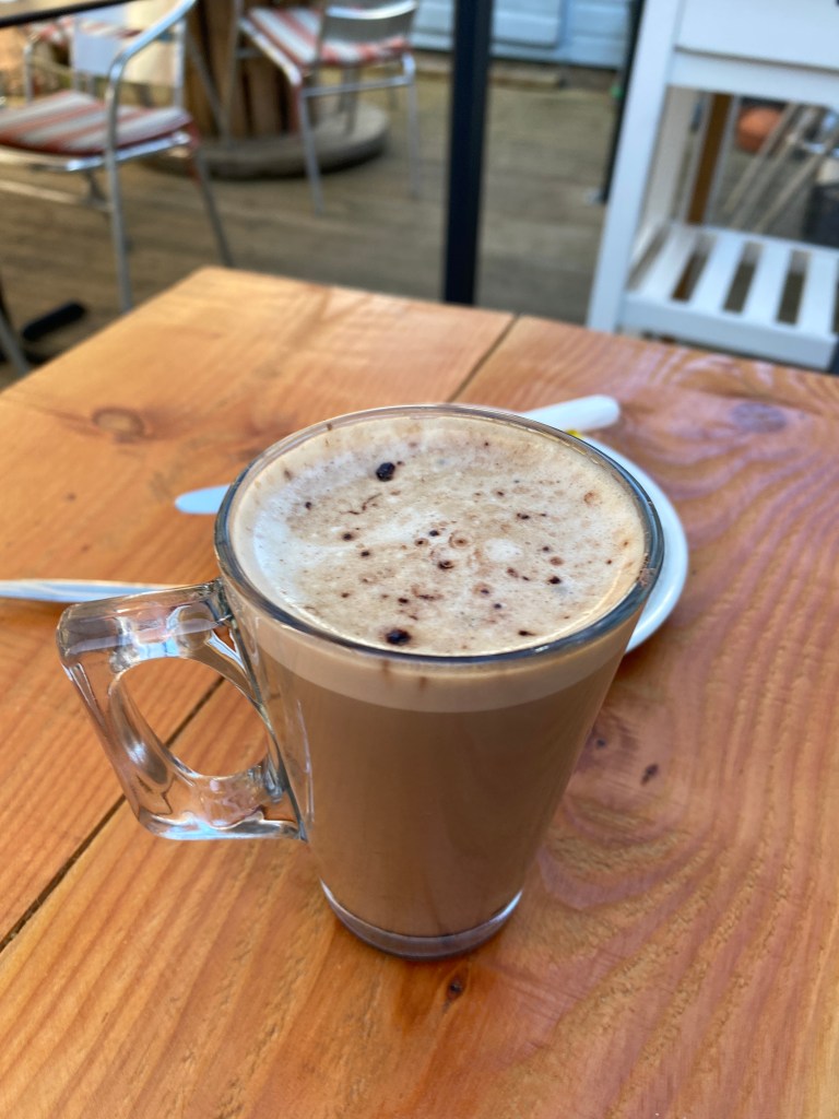 Having achieved what I went there for, I decided I had the capacity to try the coffee shop that I had seen signs for on my way – Eli’s Craft, Cakes and Coffee. The town itself was rather quiet (I couldn’t believe it, on a day like that!) and while there were a few covers in the tiny cafe/artisan shop, coming and going, there was still plenty of space outside – a couple of tables at the front, and a whole “Secret Garden” at the back.