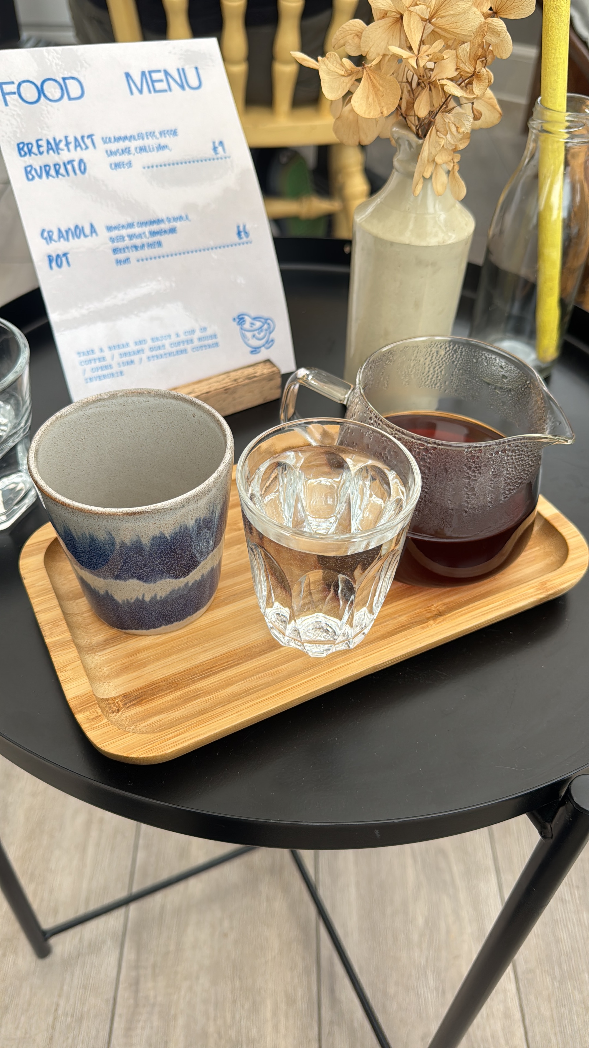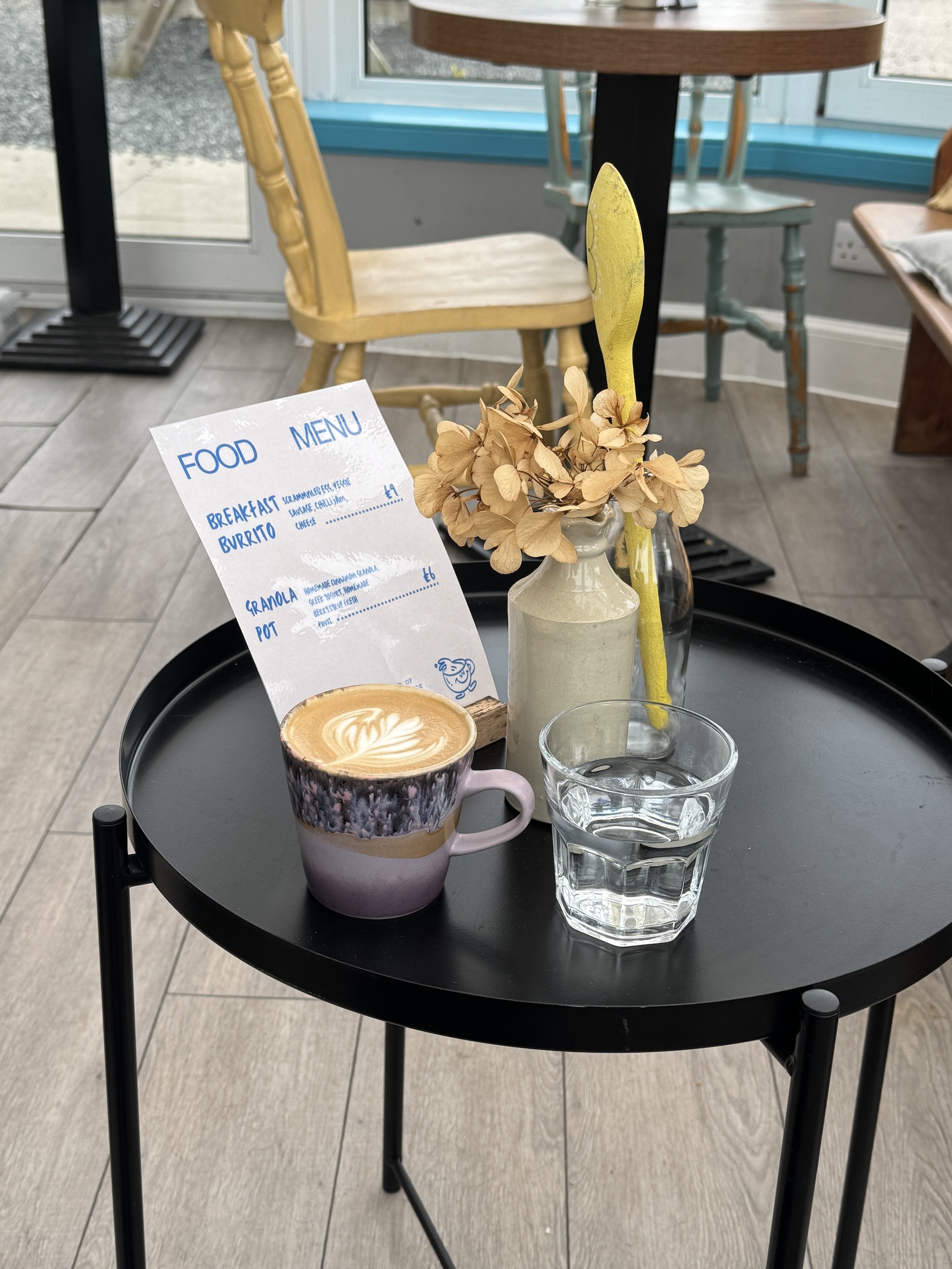 There were a few comings and goings in the short time I waited for my coffee; sadly, a few of them left soon after sitting down, once they realised the food menu was limited to only two options, one of them being a granola pot bowl, the other a scrambled egg burrito. There were other , more traditional options in the display cabinet by the counter: bakes, energy balls – but not a huge selection.