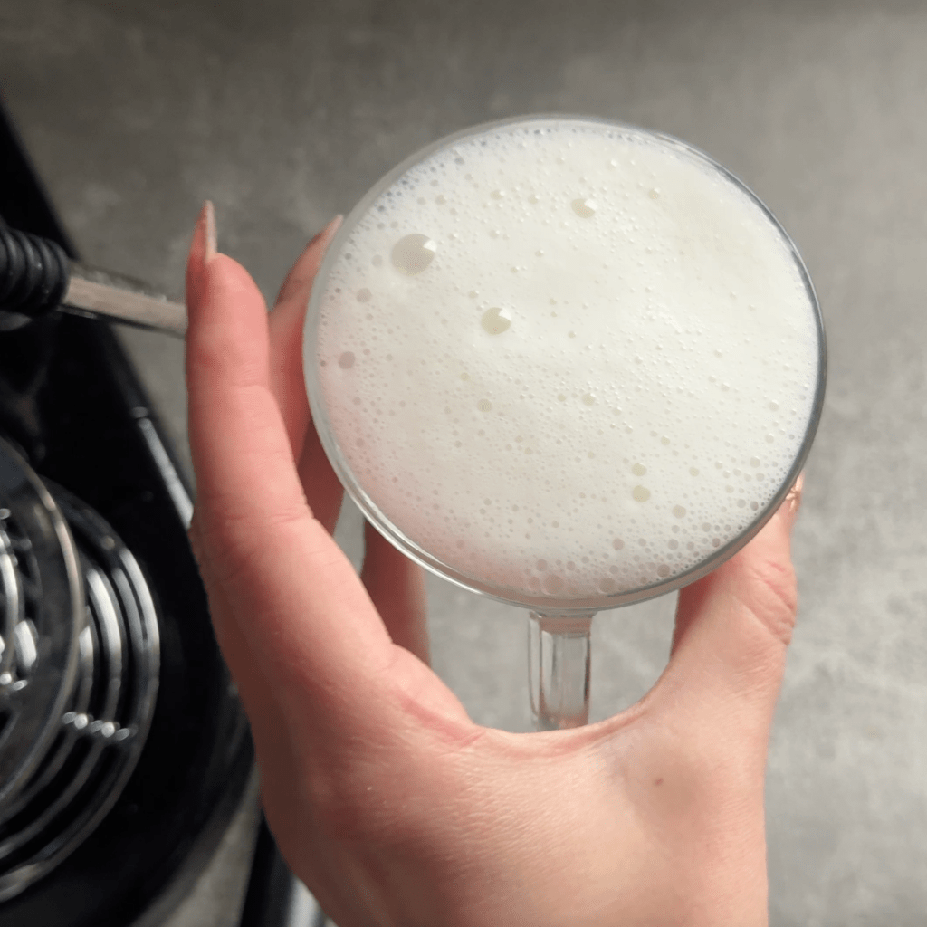 Whole milk is the easiest to work with: its higher fat content gives a smoother, more stable texture and more forgiving pouring. Semi-skimmed milk can work well too, though it tends to foam slightly more aggressively. Skimmed milk produces large, dry foam and is harder to control.