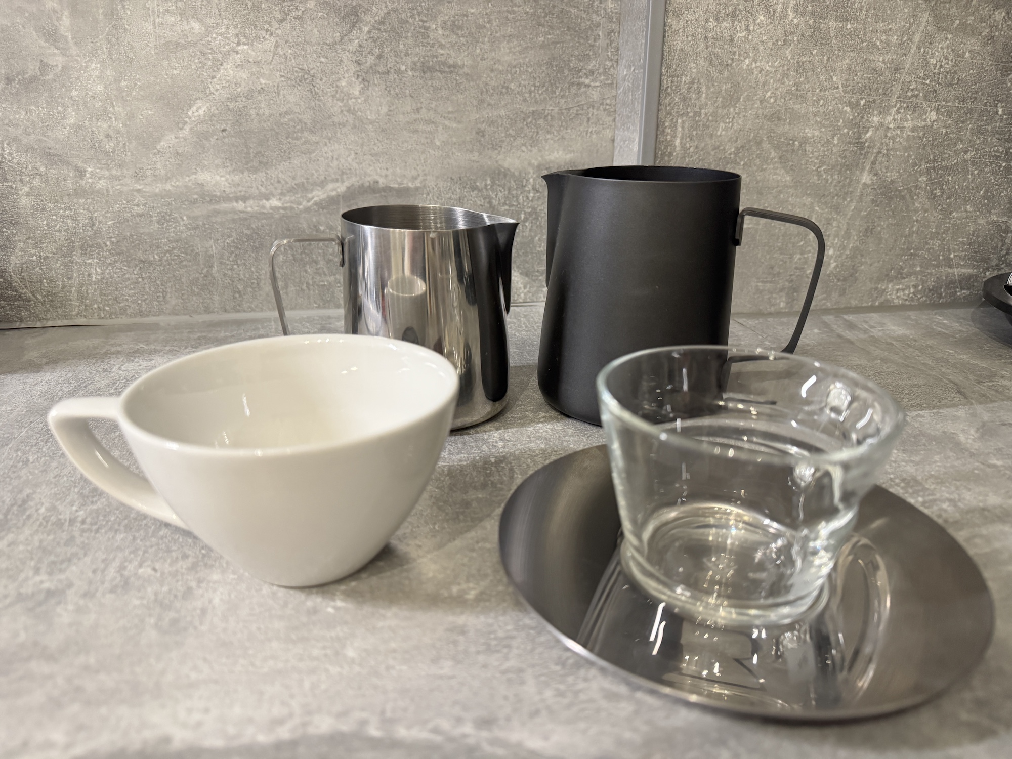 A small stainless steel milk jug with a narrow, defined spout gives you control over the flow of milk. The spout acts almost like a pen tip, allowing you to “draw” on the surface of the coffee.